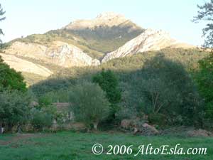 con laderas vestidas de robles y de enebros, a la espalda; y de frente,
